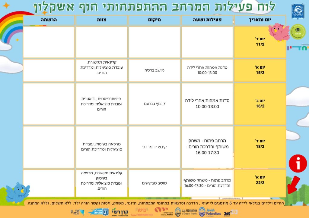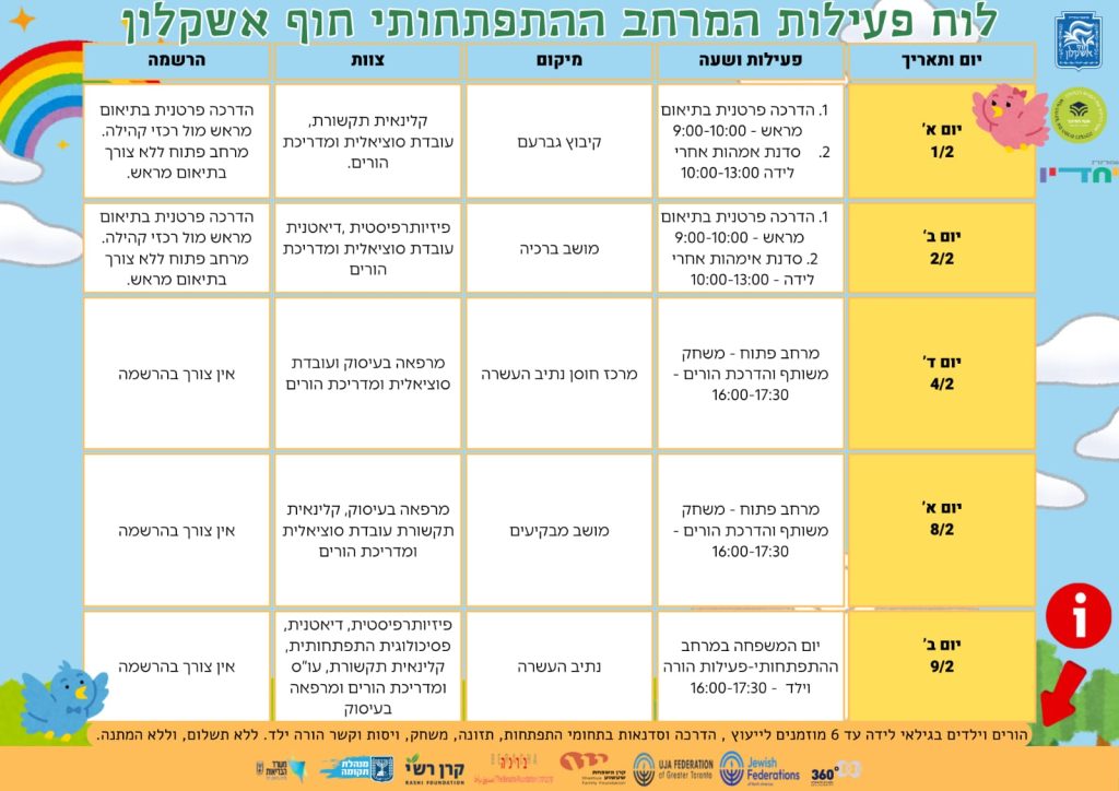המרחב ההתפתחותי בחוף אשקלון מציע הזדמנות ייחודית, להורים ולילדים בגילאי לידה עד 6 שנים, למשחק חוויתי ולייעוץ התפתחותי מקצועי, חיזוק הקשר וקבלת כלים מעשיים להמשך הדרך.
